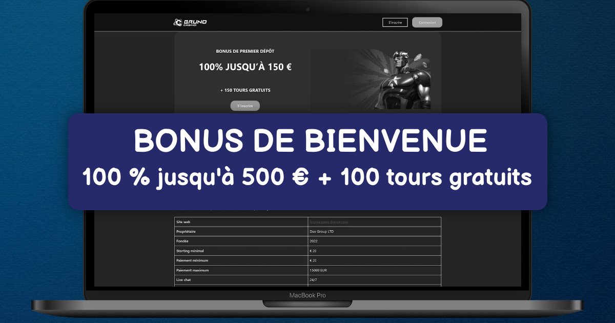 Bruno Casino propose un bonus de 100% jusqu’à 150€ et 150 tours gratuits pour un dépôt de 15€ minimum, offre valable pour les nouveaux comptes créés via l’inscription sur le site officiel.